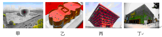 1、单选题 2010年10月30日,上海世博会顺利闭幕,其主题“城市,让生活更美好”深入人心,结合英国馆甲、澳大利亚馆乙、中国馆丙和巴西馆丁景观图,回答问题。