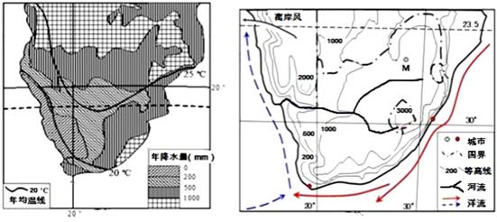 (1)读图,图示区是非洲南部,据等温线的弯曲判断,内陆比沿海气温高,影响因素是海陆热力性质的差异。东岸受莫桑比克暖流影响,气温较高,西岸受本格拉寒流影响,气温较低。所以东岸比西岸气温高,是因为洋流的影响。