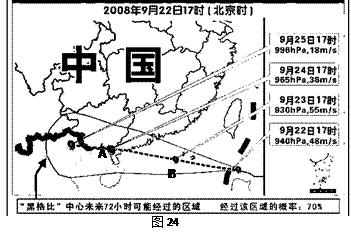 资料2:2008年9月24日,广东省遭遇了12年最强的台风黑格比的吹袭,分别导致海水入侵遂溪,广东、广西多个地区被洪水围困,多出山体滑坡,多人失踪、伤亡,带来巨大的人员财产损失。图24是黑格比路径图。