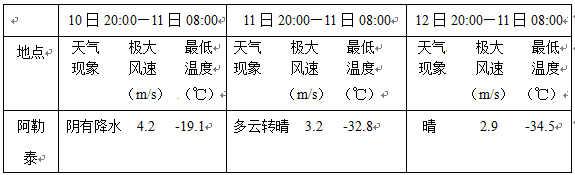 2月10—12日强寒潮期间阿勒泰地区天气现象及气象要素与最低温度情况: