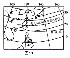 (1)若西太平洋副热带高压脊线移到图23所示位置并长时间滞留,即锋面雨带长时间滞留在??地区,试分析其对我国东部所造成的自然灾害情况。