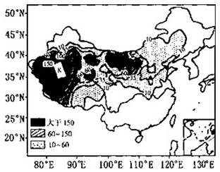 5、综合题 目前,频发的沙尘暴越来越引起人们的关注。读中国沙尘天气日分布图,完成各题。(10分)