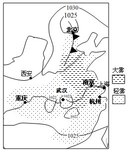 【小题1】根据等压线数值,西安受高压影响没有出现降水,盛行下沉气流,没有雾,A错。根据图例,重庆有轻雾,气压可能值为1023百帕,B错。南京有大雾,但是南京纬度低,日平均气温比北京高,C错。武汉有轻雾,是低压中心控制,天气阴雨,D对。