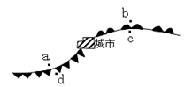 本题考查常见天气系统与天气。该图表示北半球锋面气旋天气系统。根据图中锋面符号判断,城市中心为低压,a地位于冷锋锋后,可能出现降温、雨雪等天气;c地位于暖锋锋后,刮偏南风;b位于暖锋锋前,暖锋雨区位于锋前。所以本题选择B选项。