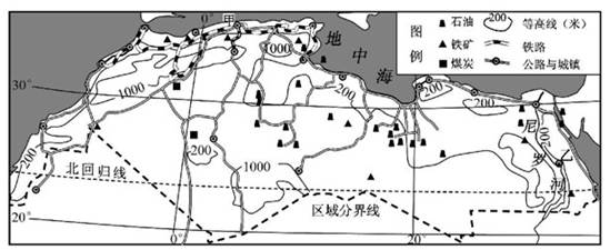 2、综合题 图a为北非简略,图b为甲、乙两地气温和降水统计图。读图回答问题。(7分)