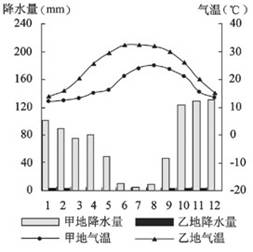 分析甲、乙两地气温和降水的差异,并从气压带、风带的移动规律分析产生上述差异的原因。(7分)