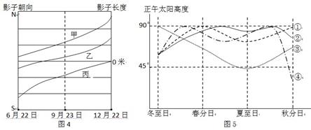 3、单选题  图4为甲、乙、丙三地6月22日至12月22日等高旗杆正午影子变化曲线和朝向示意图。读图回答问题。