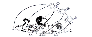 图中小姑娘在每天北京时间12:44分观测到太阳处于上中天的位置,①②③是两分两至