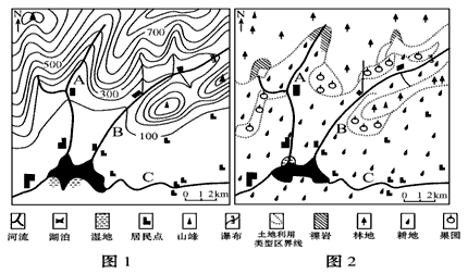2、综合题 流域是一个相对独立的自然地理系统,它以水系为纽带,将系统内各自然地理要素连结成-个不可分割的整体。随着人类活动的加剧,流域已成为区域人地关系十分敏感而复杂的地理单元。图1是某时期某流域局部地形图,图2是10年后该地区土地利用状况图,图3是该地区的月平均气温变化曲线和降水量柱状图。读图完成下列问题。