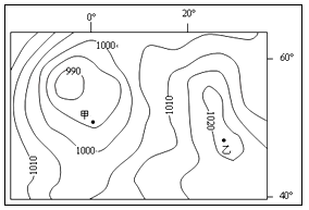 (1)读图等压线可知,东部乙地气压高于1020pa,高压为中心等压线稀疏,气压梯度力小;西部气压低于990pa,中心为低压,等压线稠密,气压梯度力大。