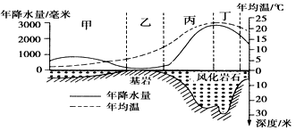 【小题1】从图示可以看出,岩石的风化作用与气温和降水量的变化具有一致性。故高温多雨的地区,风化作用最强,故为丙丁两地。