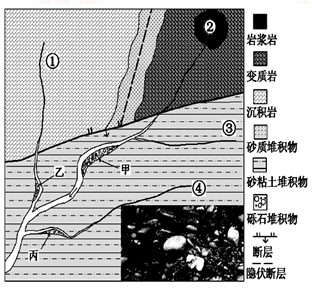 5、单选题  下图是某流域地质简图,甲、乙、丙三地有砾石堆积物(见图右下角照片),在甲地砾石堆积物中发现了金刚石(碳在高温高压条件下形成)。读图回答下列小题。