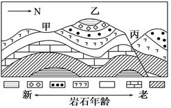 第(3)题,判断乙处地质构造依据有二:岩层弯曲形态及岩层新老关系。