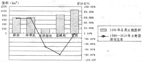 小题1:读图,结合图例分析,水体湿地面积减少40﹪,减少面积约400平方千米,耕地增长面积约700平方千米,A错。盐碱地面积减少超过70﹪,而耕地草地面积明显增长,说明大量盐碱地被改良成农业用地,B错。荒漠面积变化率为0,没有持续扩大趋势,C对。林地、草地面积增加,说明没有毁林、过度放牧问题,或是问题不严重,D错。
