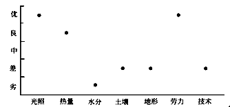 小题2:结合材料反映该地区影响农业生产最大的不利条件是水分,最大的有利条件是光照和劳动力,故符合西北地区。