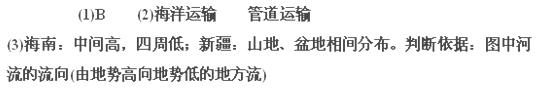 (2)受地理位置、地形、资源等因素的影响,两省区的主要交通方式除了公路和铁路运输外,海南还有?,新疆还有?。(4分)