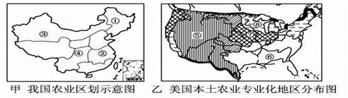 小题3:甲图③区是我国的西北地区,主要以畜牧业和绿洲农业为主。美国主要在西部地区。符合的D项。