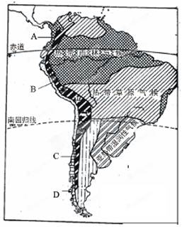 本题解析:本题考查世界区域地理。(1)影响该处热带雨林气候的成因主要从大气环流、地形、洋流等方面分析。(2)阿根廷为世界著名的大牧场放牧业国家。其发展的有利条件主要从土地、草原和交通等方面分析。(3)B地区位于安第斯山脉的西侧,受地形阻挡及沿岸秘鲁寒流的影响,故气候类型呈狭长分布。