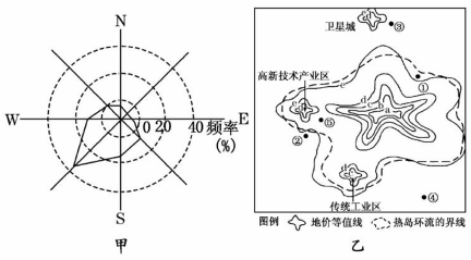5、单选题 图甲是位于平原地区的某城市风向频率图,图乙是该城市地价分布概念图(地价等值线数值a、b、c、d、e依次递减),读图回答题。