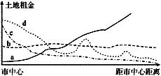 1.图中能正确表示城市从市中心到外缘地租水平变化趋势的曲线是2.在地租最高峰和次高峰一般形成的功能区是