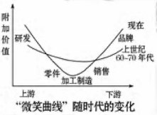 5、单选题  “微笑曲线”(下图)是用于说明电脑行业不同环节与所实现的附加价值之间的关系,后来被广泛应用于其他领域。据此回答14、15题。
