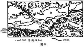 (1)图中省会城市A是__________,铁路干线B是__________,C是____________。 (3分)