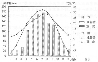 材料二:图l4为吐鲁番与重庆市气候统计图