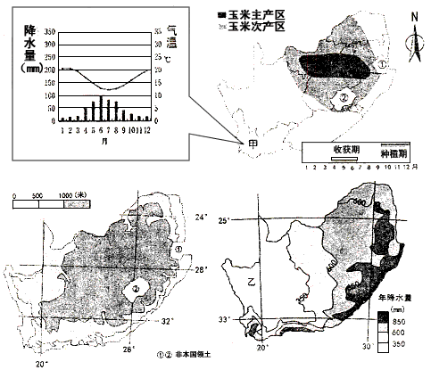 5、综合题 读下图(某国家玉米产区、地形、年降水量分布及该国甲省区气候统计图),回答下列问题。