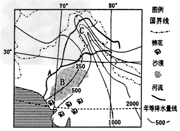 (2)描述图中C地区年等降水量线的分布特点并分析原因。