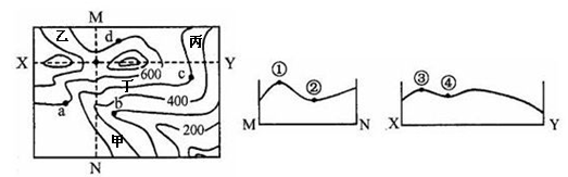 1.a.b.c.d四点中,最容易发育成河流的是2.图中MN.XY的交点,在剖面图中是3.甲.乙.丙.丁四地中,为向阳山坡的是