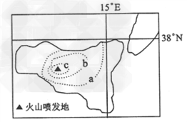 5、单选题 下图中虚线是某岛火山喷发后火山灰厚度等值线, a< b< c,读图完成1 ~2 题。