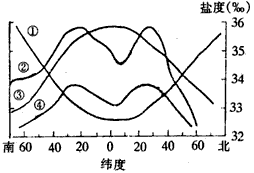 1、单选题 下图的四条曲线中,正确表示海洋表面平均盐度按纬度分布规律的是