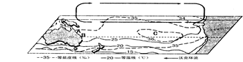 材料二?下图是南太平洋等盐度线、等温线及赤道附近的沃克环流示意图。
