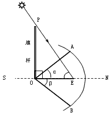 (2)若杆影OA与OB相等,则α _________(大于、小于或等于)β;如0A表示地方时10时,则OB表示的
