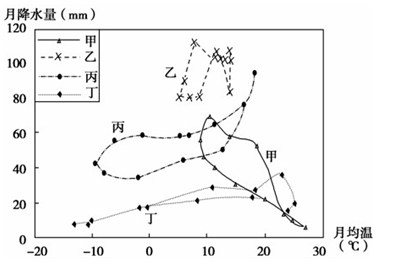 1、单选题  图为四地气象资料图,图中符号代表各地每月的平均气温和降水量。读图回答27~28题。