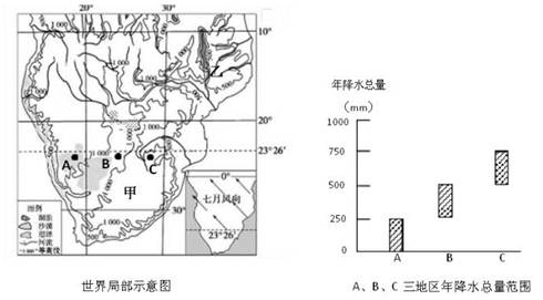 (2)说出沿回归线年降水总量的分布特点(2分)。并分析A、C两地区荒漠和草原景观形成的原因。(8分)。
