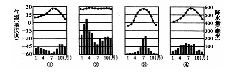 本题解析:有图知:气候①为冬雨型,故为地中海气候,气候②全年高温多雨,为热带雨林气候,气候③夏季高温多雨,最冷月气温低于0oC,为温带季风气候,气候④夏季高温多雨,最冷月气温高于0oC,为亚热带季风气候。