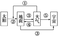 2、单选题 右图中各箭头及其代表符号①、②、③、④、⑤表示太阳、地面、大气、宇宙空间之间的热力作用,其中包括太阳辐射、地面辐射、大气辐射、大气逆辐射、大气对太阳辐射的削弱作用(吸收、反射和散射)。我国青藏高原的纬度比云贵高原高,但年太阳辐射总量比云贵高原大,其原因主要与图中的哪个因素数值大小有关( )