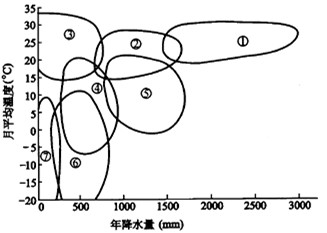 5、单选题 下图表示气温,降水与气候类型的关系。读图,回答1—4题。
