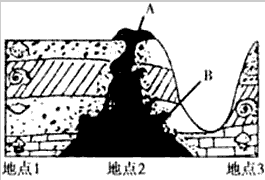 (3)地点2处的岩石,A属于______型岩浆岩,B属于______型岩浆岩,B岩体周围附近可能形成________