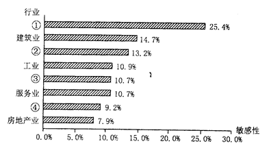 小题1:对气象条件敏感性可以理解为人类活动对大气的影响程度,人类活动对大气的影响主要是通过改变地面状况和影响大气成分来影响气候。图中敏感性越大说明影响程度越大。根据不同行业的特点,农业影响最大,因为农业直接改变地表,金融业影响最小,零售业(各种商品的制造和消费环节排放大量废弃物)、交通运输业(机动车尾气排放)影响较大。故选A。