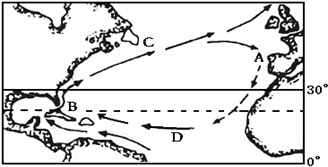 (2)若只考虑顺风、顺水的条件,某船从A航行到B,再返回到A,那么,途经D时利用的盛行风是?,途经C时利用的洋流是?。