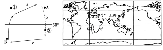 (2)?若左图大洋环流位于太平洋,则a、c所代表的洋流分别为_______、_______(填洋流名称),按洋流的寒、暖流性质分类,a属?_______流,b属_______流;左图 a、b、c三条洋流中,属风海流的是