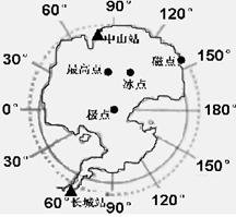 3、单选题 2008年10月20,我国第25次南极科考队从上海港出征。此次科考的任务之一是在南极的最高点(即冰穹A:78°E,80°S)建设我国第三个南极科考站——昆仑站。读图回答题。