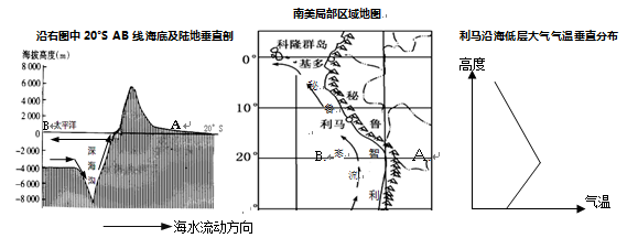 (1)考查气候特征的判断和成因的分析。特征分析在于气温的高低和变化及降水量多少及变化。根据材料2判断利马为热带沙漠气候,全年降水量稀少,全年温度在15°以上日温差大,冬暖夏凉,年温差小,同时大雾天气多,考查学生提取信息的能力。气候成因主要考虑纬度、地形、洋流、海陆位置、大气环流等。降水少—在10°S—20°S之间,受来自大陆干燥的东南信风的影响;全年气温在15℃—纬度低,获得太阳辐射量多。冬暖夏凉——受海洋的影响,年温差小,同时寒流的影响;日温差小—干旱,大气的削弱作用和保温作用小;大雾天气——沿海寒流经过,降温的作用,使得水汽碰到冷地面凝结成为雾,且形成逆温层,无不易扩散。