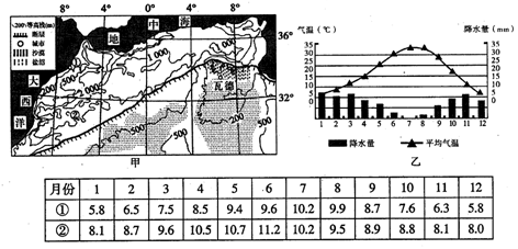 2、综合题 甲图为马格里布地区示意图(今突尼斯、阿尔及利亚和摩洛哥所在地区统称为马格里布地区),乙图为该地区瓦德市的气候资料统计图,下表为甲图中①②两城市各月平均日照时数表(单位:小时)。据此回答下列问题。(14分)