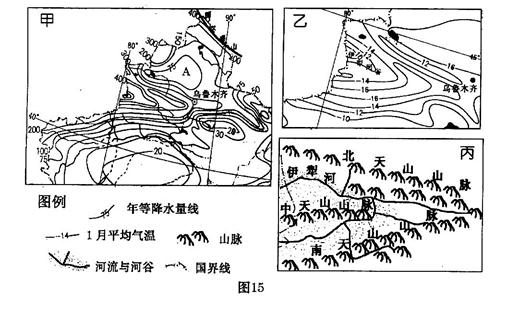 4、综合题 新疆的伊利河谷被誉为“中国天府”、“西域湿岛”。图15中甲为新疆局部地区年降水量分布图(单位:mm),乙为天山西段1月平均气温分布,丙为伊犁河谷地区分布示意图,回答下列问题。(12分)