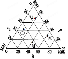 1.如果a、b、c分别代表影响工业区位的原料因素、能源因素、市场因素,则下列最能代表炼铝工业的点是2.如果a、b、c分别代表科研费用、能源费用、原料费用所占的比重,则能表示高科技产业的点是:
