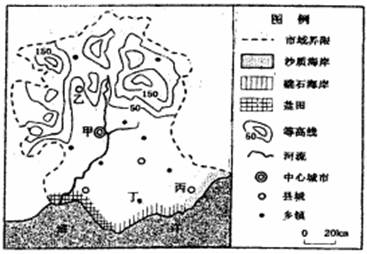 小题1:从等高线看,该区域北部地势起伏较大,可建设生态观光农业,为城市居民提供休闲场所;西南部沿海有盐田,可为化学工业提供原料,且该地区位于冬、夏季风的垂直方向,可建设工业基地,发展海洋化学工业;丙地为沙质海岸,沿海沙滩水浅,不利于建设大型货运港口;海水淡化成本较高,而农业耗水量又大,不适宜采用海水淡化来解决农业用水紧张状况,选D。