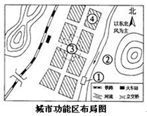 小题1:从城市功能区合理布局的角度考虑,若图中分别布局中心商务区、住宅区、城郊农业区、港口码头四个功能区,则①、②、③、④对应的功能区是